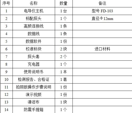 1. 電導(dǎo)儀主機(jī)一臺(tái),標(biāo)配探頭一個(gè)(直徑12mm),校準(zhǔn)標(biāo)塊兩塊(進(jìn)口材料),高頻連接線一條,數(shù)據(jù)傳輸線、數(shù)據(jù)處理軟件、探頭套一個(gè),充電器一個(gè),防震手提工具箱一個(gè),使用說(shuō)明書(shū),儀器操作步驟拍照版,演示視頻,清潔布。