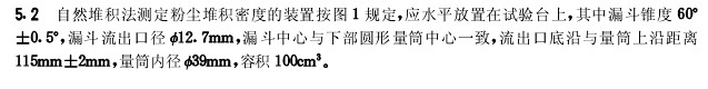 1 范圍 本標(biāo)準(zhǔn)規(guī)定了測定粉塵堆積密度的一種實(shí)驗(yàn)方法-------自然堆積法。 本標(biāo)準(zhǔn)適用于粉塵堆積密度的測定 2 引用標(biāo)準(zhǔn) 下列標(biāo)準(zhǔn)所包含的條文,通過在本標(biāo)準(zhǔn)中引用而構(gòu)成為本標(biāo)準(zhǔn)的條文。本標(biāo)準(zhǔn)出版時(shí),所示版本均為有效。所有標(biāo)準(zhǔn)都會(huì)被修定,使用本標(biāo)準(zhǔn)的各方應(yīng)探討使用本標(biāo)準(zhǔn)最新版本的可能性。 GB/T 16913.1-1997 粉塵特性試驗(yàn)方法中第三部分:試驗(yàn)塵樣的采集 3 定義 本標(biāo)準(zhǔn)采用下列定義及中定義及GB/T 16913.1中定義。 粉塵堆積密度 包括粉塵內(nèi)部孔隙和粉塵之間空隙在內(nèi)的單位體積粉塵松散體的質(zhì)量。 同義詞:粉塵表觀密度。 4 原理 粉塵從漏斗口在一定高度自由落下充滿量筒時(shí),測定松裝狀態(tài)時(shí)量筒內(nèi)單位體積粉塵的質(zhì)量,即粉塵堆積密度。 5 設(shè)備 5.1 80目標(biāo)準(zhǔn)篩電熱干燥箱等實(shí)驗(yàn)室常規(guī)設(shè)備。 5.2 自然堆積法測定粉塵堆積密度的裝置按圖1規(guī)定,應(yīng)水平放置在試驗(yàn)臺(tái)上,其中漏斗錐度60°±0.5°漏斗流出口徑φ12.7mm,漏斗中心與下部圓形量筒中心一致,流出口底沿與量筒上沿距離量筒內(nèi)徑115mm±2mm,量筒容積100cm3。 粉塵自然堆積密度計(jì) 5.3 工業(yè)天平(最大稱量1Kg,感量2mg,精度5級) 5.4 容積120ml的盛樣量筒,平直的塵樣刮片。 6 測定步驟 6.1 試驗(yàn)塵樣的采集應(yīng)符合GB/T 16913.1的規(guī)定。登記粉塵采樣工況。 6.2 塵樣在105℃下干燥,放置室內(nèi)自然冷卻后通過80目標(biāo)準(zhǔn)篩除去雜物,準(zhǔn)備測定。 注:對于在小于等于105℃時(shí)就會(huì)發(fā)生化學(xué)反應(yīng)或熔化,升華的粉塵,干燥溫度須相應(yīng)降低。 6.3 按圖1規(guī)定將測定裝置各部件組裝于試驗(yàn)臺(tái)上,調(diào)整水平。 6.4 用塞棒塞住漏斗流出口。將塵樣裝入盛樣量筒,用刮片刮平后倒入漏斗中。 6.5 拔出塞棒使粉塵自由落至下部量筒中,待漏斗中粉塵全部流出后,用刮片將堆積于量筒上部粉塵刮去。 6.5 把裝有粉塵的量筒放到天平上稱重。 6.6 粉尖堆積密度按式(1)計(jì)算: