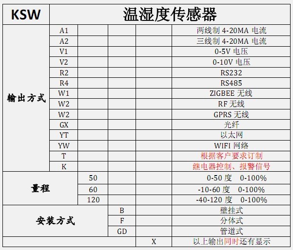 2.1技術參數供電電壓: 24VDC/12VDC 使用場所: 室外/室內 防水類型: 防水 測量范圍: -40-120度(客戶可根據自己需要選擇大小) 準確度: 溫 度:± 0.5℃ (0℃~50℃) 輸出形式: 4-20MA/0-5V/RS485/RS232/繼電器輸出(本身具有) 濕度量程: 0-100%RH 準確度: ±3% 長期穩定性: 濕度<1%RH/年 溫度<0.1℃/年 響應時間: <15s(1m/s風速) 負載能力: 電流輸出型:≤ 500Ω、 選型表 |