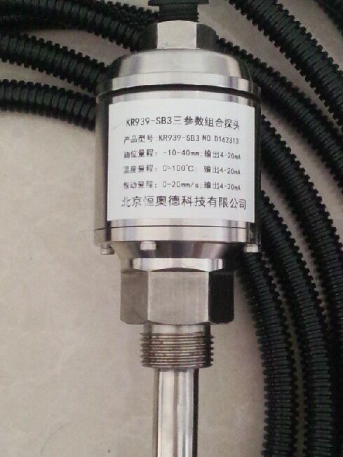 ●K1-KR-939SB3型一體化三參數組合探頭,以外螺紋形式安裝于風機減速箱(或其它被測設備)上部的螺紋孔中,探桿插入減速箱內,從而獲取減速箱中潤滑油溫度、潤滑油油位和箱體振動信號,完成變送輸出。